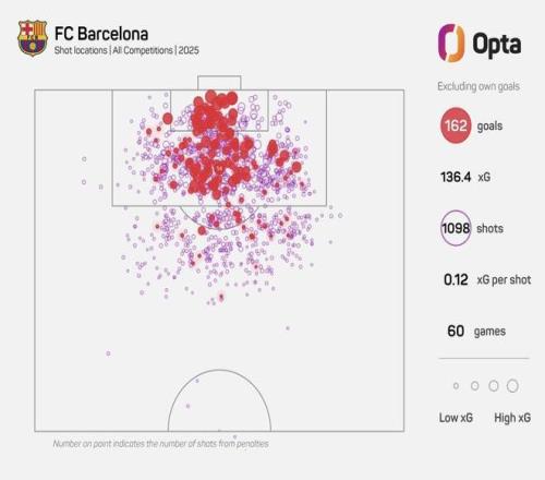 根据Opta统计的数据,巴塞罗那在2025年各项赛事(包括乌龙球)的60场比赛中攻入169球,创造了西甲球队在没有梅西或C罗的情况下,单年进球数的新纪录。