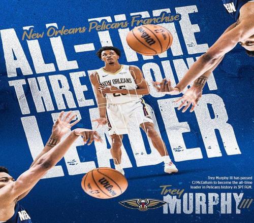 凭借着第二节还剩3分59秒命中的一记三分,鹈鹕球衣特雷·墨菲三世正式超越CJ·麦科勒姆,以693记三分加冕鹈鹕队史三分王。
